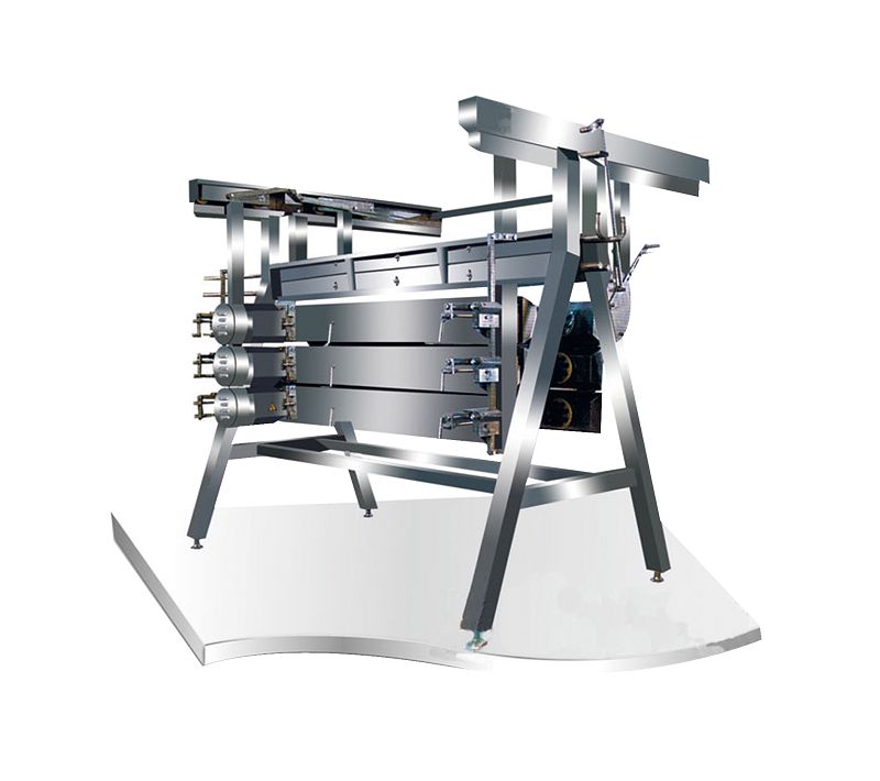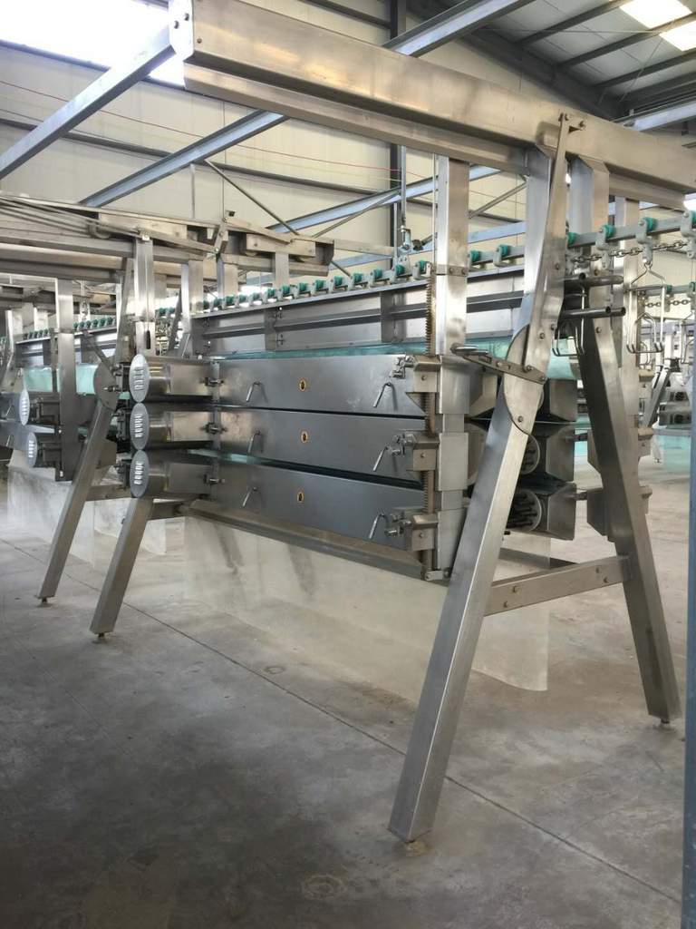 产品概述:用于肉禽加工中的粗脱毛工作,经该机脱毛后,禽体表皮无损伤,脱毛率高,本系列脱毛机可多种方式组合,满足不同产量要求,有普通型(6箱*10盘)和加长型(6箱*16盘),两种型号可供不同需求的用户选择。结构特征:采用机械传动方式,依靠禽类肢体与橡胶棒之间的相对摩擦运动,脱去禽类羽毛,采用A字型支架,脱毛箱可开闭,维修方便,箱体调节机构主要有高度调节机构,宽度调节机构和角度调节机构三部分组成,将箱体调节到最适宜的脱毛状态。技术参数:1.外形尺寸:3400*2350*2500(普通型)4950*2350*2500 (加长型)2.电机功率:(2.2KW-6)*6台(普通型)(2.2KW-6)*12台(加长型)